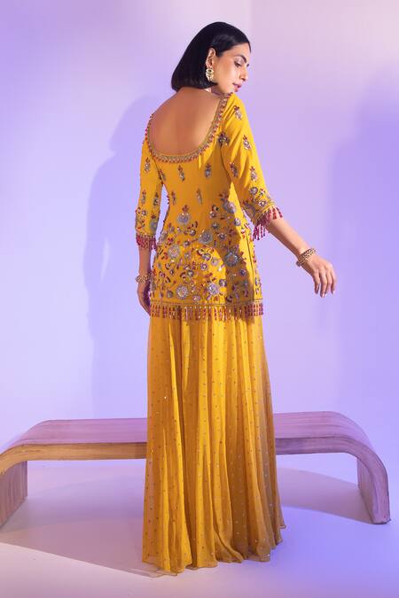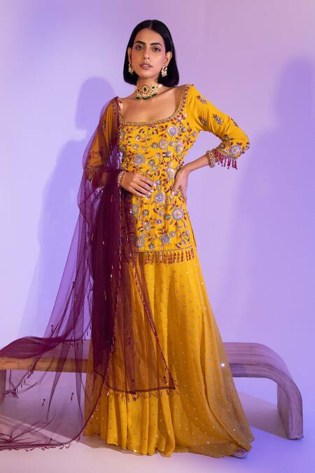 Mustard yellow kurta featuring three fourth sleeves, square neckline, and embellished with sequins and glass beads. Paired with a coordinating sharara and contrasting maroon dupatta.
