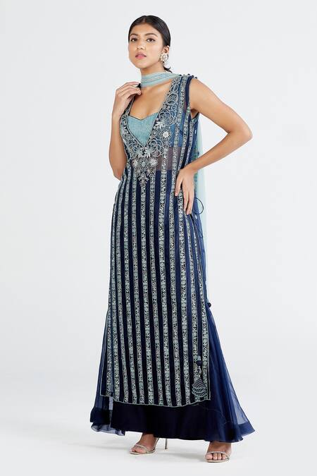 Buy_Megha Bansal_Blue Organza, Chanderi Floral, Stripes Tapan Vrit Embroidered Set_Online_at_Aza_Fashions