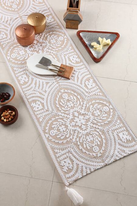 Beige table runner with white floral embroidery & tassel border.