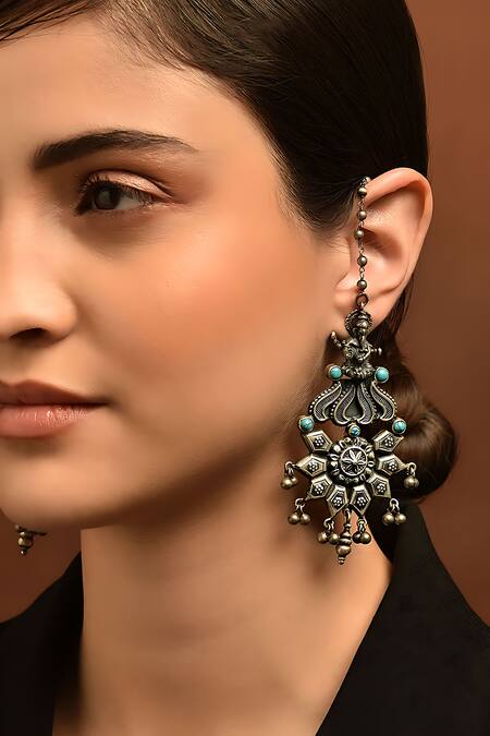 92.5 silver toned earrings with Ganesha, floral carved detailing & ghungroo bead drops.