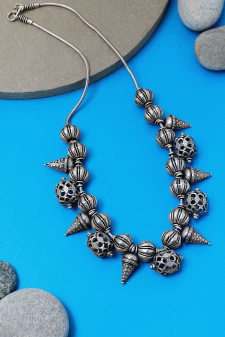 Silver necklace featuring tribal spoke design with a mix of spherical and cone-shaped beads