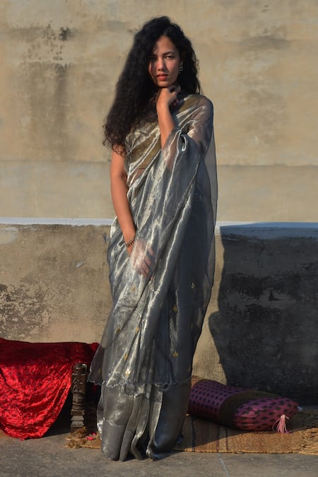 Silver Tissue Silk Hand Embroidered Thread And Zari Metallic Gota Patti Saree