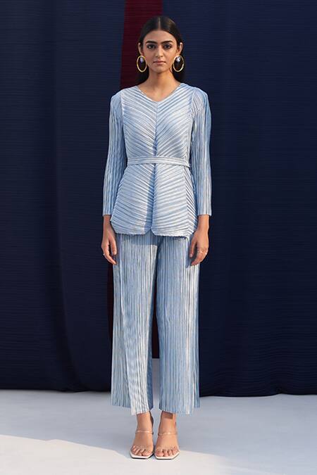 Powder blue pleated V neck long top in polyester base. Paired with matching metallic pleated culotte pant.