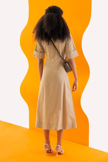 Beige Cotton Poplin Plain Slim Collar Micah Solid Utility Shirt Dress