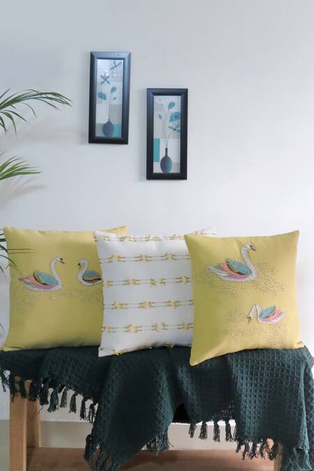 Yellow & pristine white set of 3 cushion covers in cotton base. The set includes one cushion cover with yellow tassels & golden beaded hand embroidery and two cushion covers with zardosi hand embroidered pair of swans gliding on a tranquil lake.