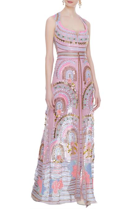 Pink long jacket with all-over 3D metal sequin work. Comes with pants.