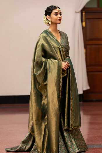 Green Brocade, Tissue Embroidery V-neck Idika Floral Pattern Kurta Gharara Set