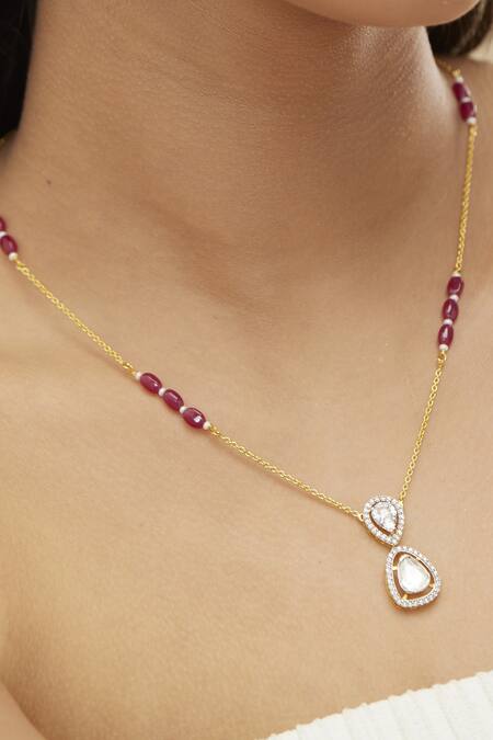 Center motif studded with moissanite polki stones, Red bead detailing on necklace, 18k gold plated finish