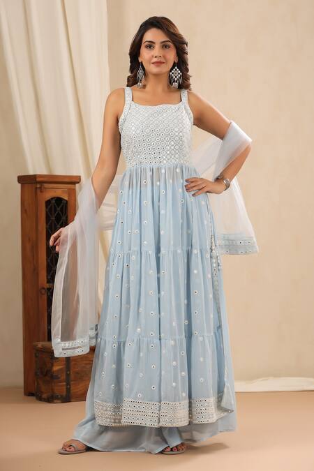 Blue georgette anarkali with tiered flare, square neck, all over mirror & thread embroidery. Paired with flared pants & dupatta with embroidered border.