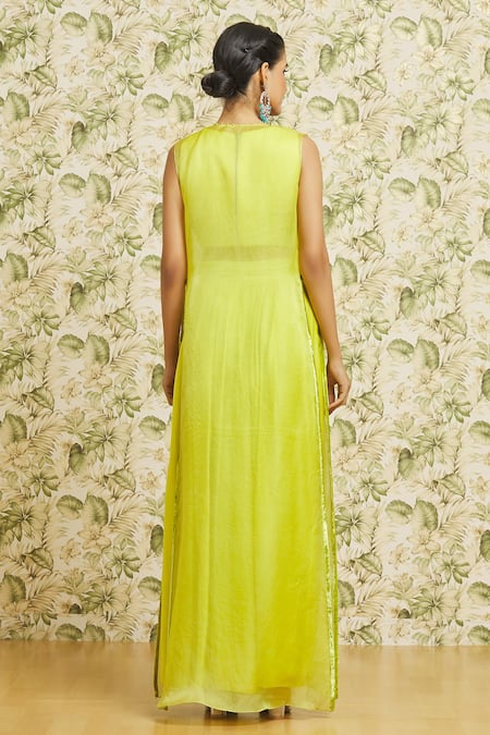 Lime green crop top featuring a round neckline with sequin embroidery in a hexagon pattern. Paired with an open organza jacket and a satin draped skirt with an inverted V hem and side slit.