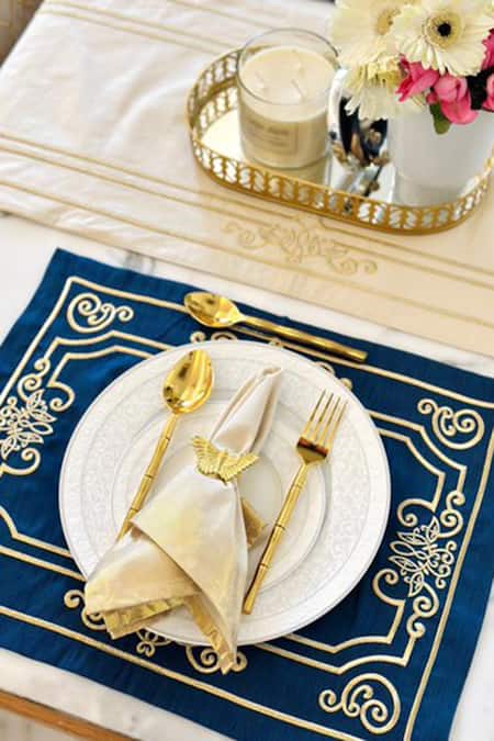 Black gift box set containing of blue set of 6 table mats with golden baroque border embroidery, beige set of 6 table napkins with golden border prints and a gold sunset in Santorini traveler candle with vanilla bean scent.