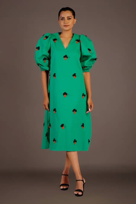 Green cotton dress with confetti, floral applique placement embroidery & puffed sleeve detailing.