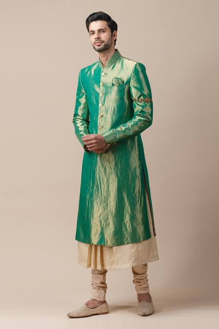 Green Tissue Silk, Katan Silk, Poplin Lycra Sherwani And Kurta Set
