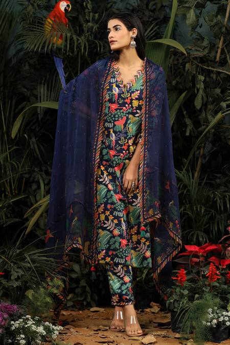 Multicolored kurta with all-over floral print, scallop edged neckline-sleeves & straight silhouette. Comes with modal satin pant & blue dupatta.