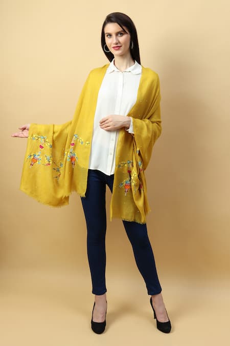 Mustard yellow shawl featuring thread embroidery in floral basket pattern on both ends