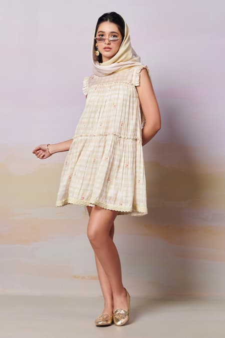 Buy_Moh India_Ivory Pure Chanderi Silk Printed Landscape After Glow Rosette Short Dress _Online_at_Aza_Fashions