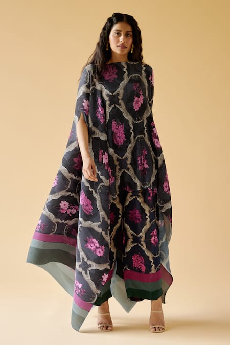 Blue asymmetric kaftan featuring a midnight dahlia print with an asymmetric hem. Paired with coordinating dahlia print pant made from pleated satin and crepe fabric.