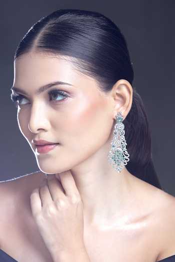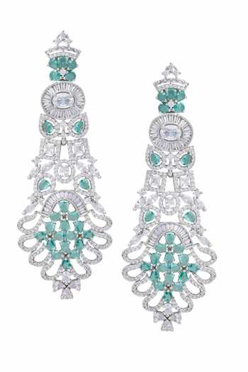 Silver floral carved earrings featuring zircon, emerald stone, and moissanite embellishments