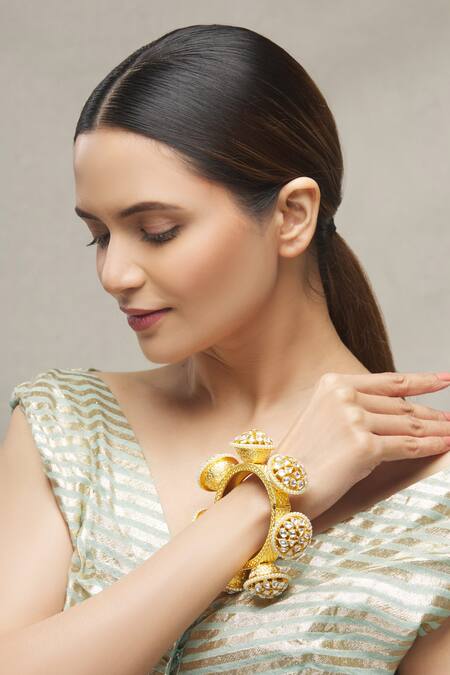 Gold-plated openable kada- bangle with encrusted kundan, carved texture & 3D motifs.