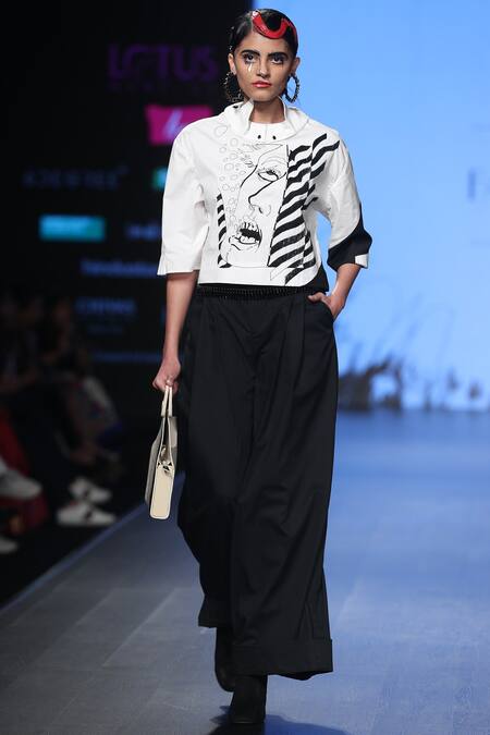 For the women who love to style up in monochromes, this white shirt with face illustration should be an ideal choice. It is paired with statement black pants for a complete styled look.