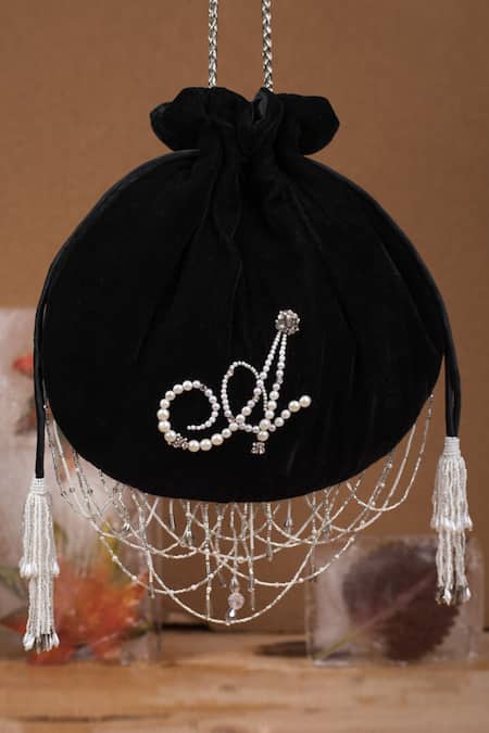 Black velvet potli featuring personalized calligraphy monogram initials and embellished with fine Japanese beads, pearls, diamantes, and crystals