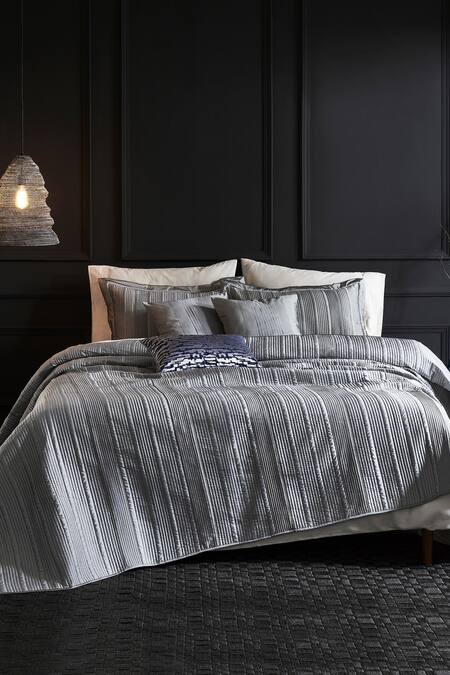 Silver crafted and embroidered silk bedding set includes a bed spread, a deck cover, 2 pillow covers and 2 cushion covers with striped patterns.