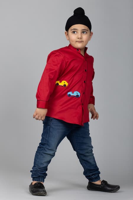Embroidered car motifs on one side, Front button closure, Band collar design