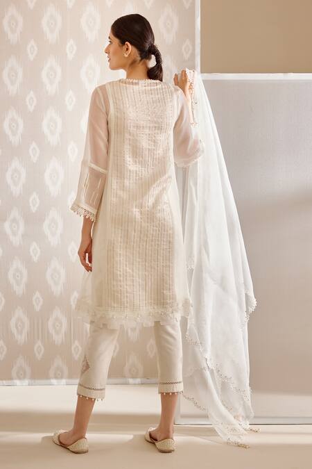 White A-line kurta with Ikat, abstract pattern panels, placement crochet lace work, bell sleeves & hand embellished bead tasselled hem. Paired with narrow pant, dupatta scalloped crochet lace border & inner slip.