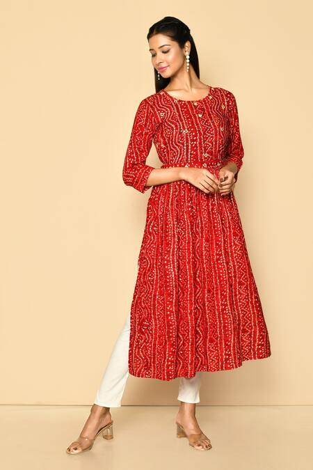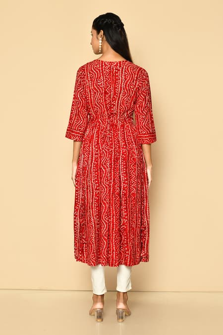 Red naira cut kurta in muslin base with bandhej print and mirror embroidery.