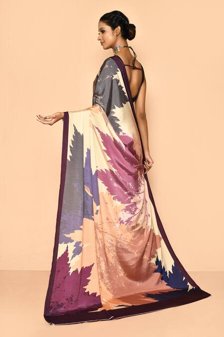 Light yellow crepe saree with abstract print. Comes with purple running blouse.