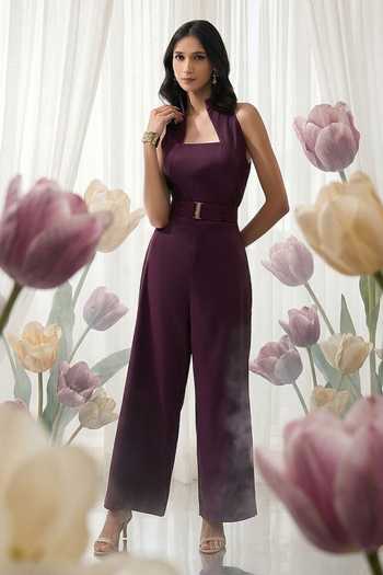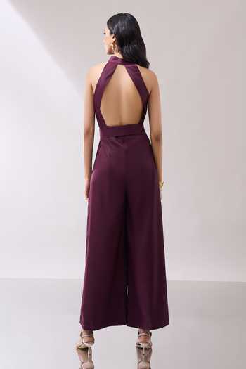Wine High-collar Back Cutout Jumpsuit With Belt