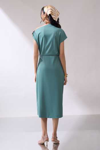 Green Lycra One Shoulder Placed Brooch Draped Dress