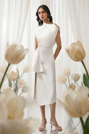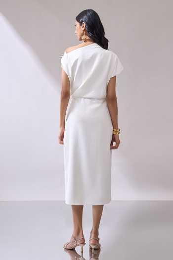 Ivory Lycra One Shoulder Placed Brooch Draped Midi Dress