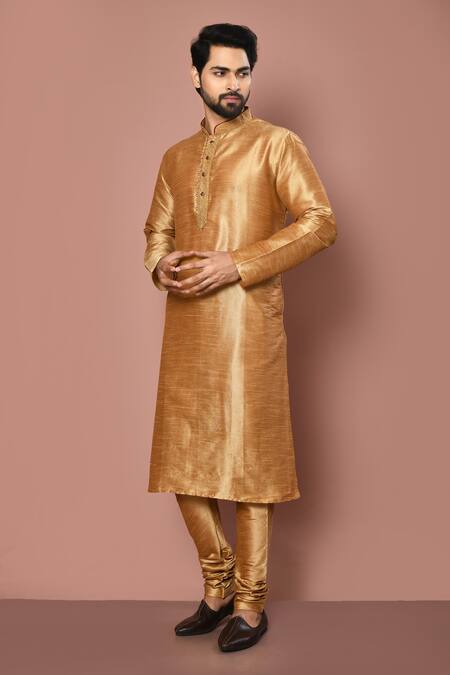 Gold dupion silk kurta with thread embroidered collar & placket. Comes with churidar.