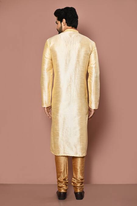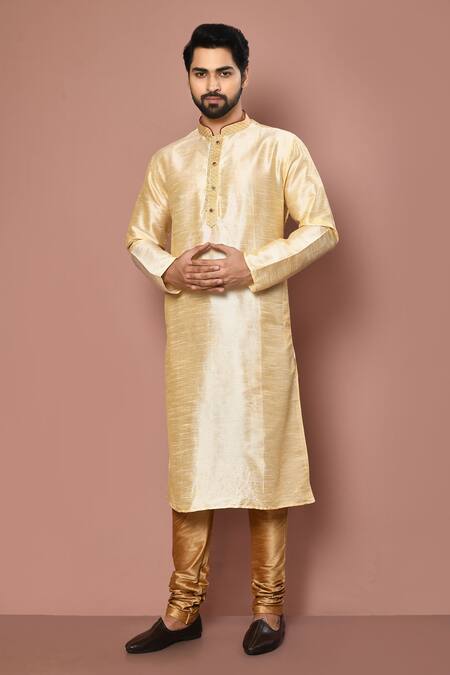 Fawn dupion silk kurta with thread embroidered collar & placket. Comes with gold churidar.