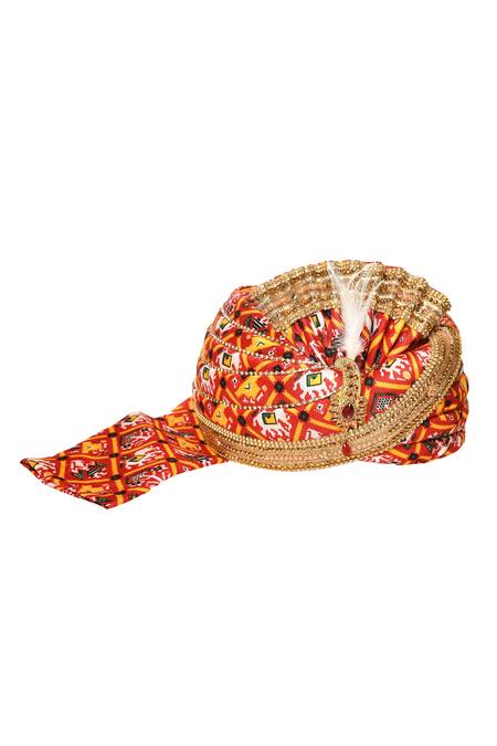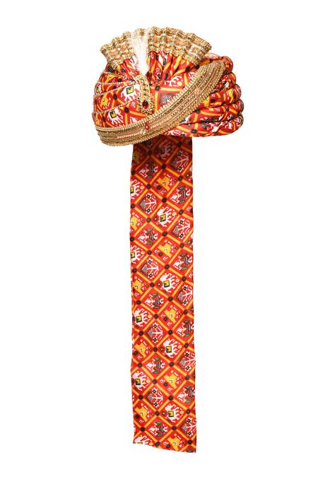 Red safa with patola print all over & glass, stone embroidered border.