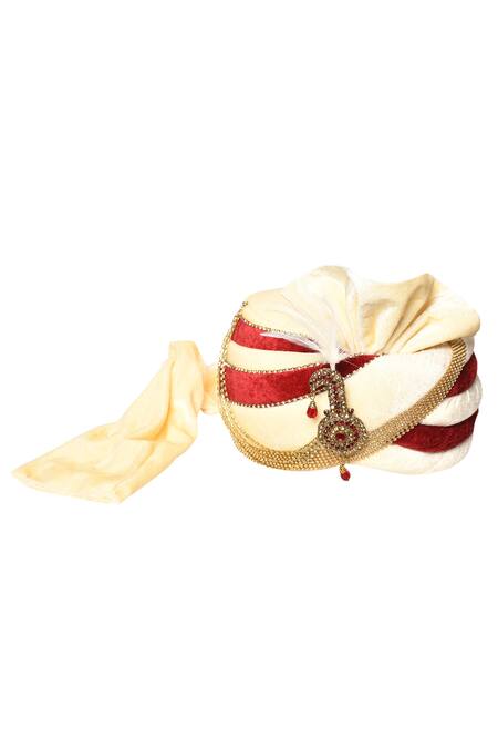 Cream, maroon colorblock safa with glass & stone embroidered border.