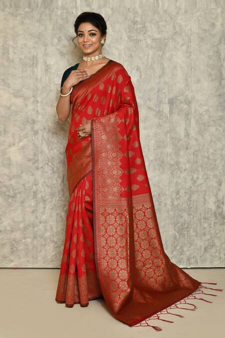 Buy_Samyukta Singhania_Red Silk Leaf Motifs Woven Pattern Saree_Online_at_Aza_Fashions