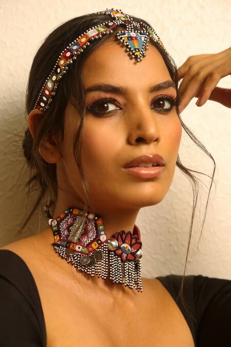Multicolor choker with embroidered lotus motif, bead work, coin and bead tassels.