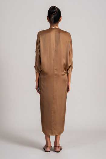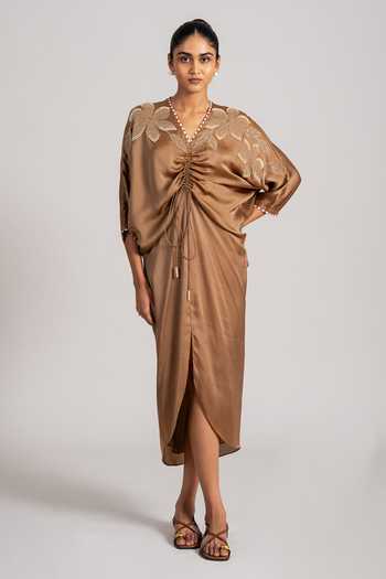 Ruched drawstring front, Bead-embellished leaf motif, Midi length