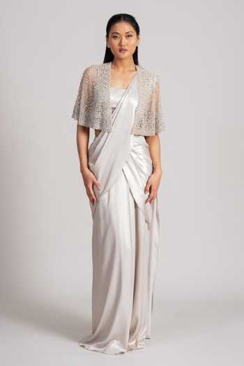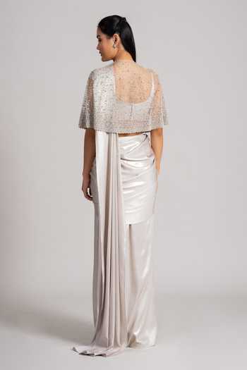 Ivory shimmer crepe pre-draped saree with glossy drape and a pearl-embellished cape. Paired with blouse.