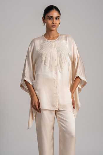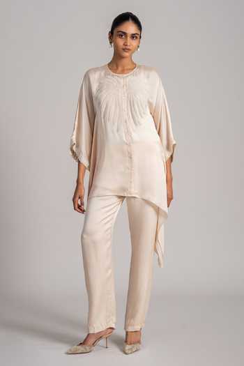 Off White Satin Round Neck Embroidered Top And Pant Set