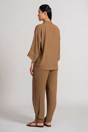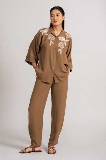 Brown pant set featuring a front-open shirt with floral embroidery. Includes a matching straight pant.