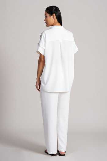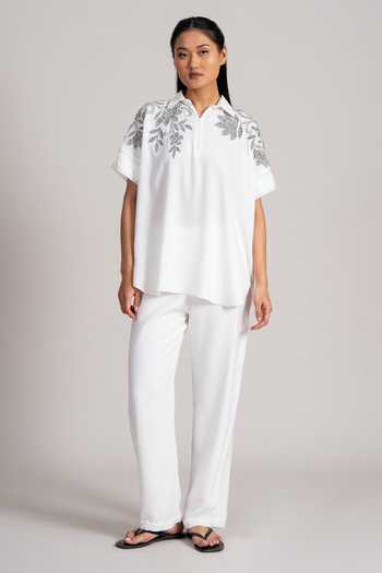 Ivory Twill Georgette shirt with shoulder floral embroidery. Paired with matching pant.