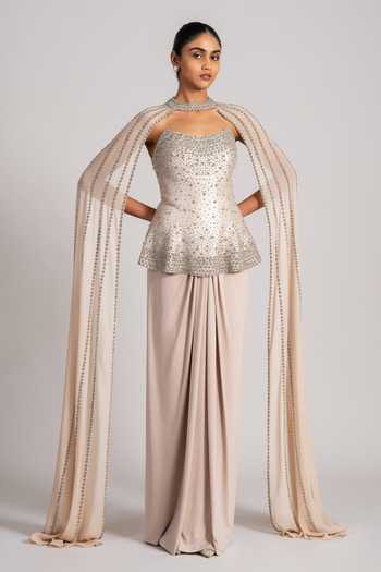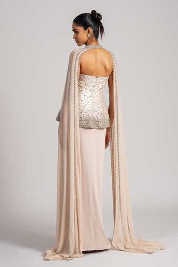 Gold shimmer crepe corset with cape and crystal embellishment. Paired with draped skirt.