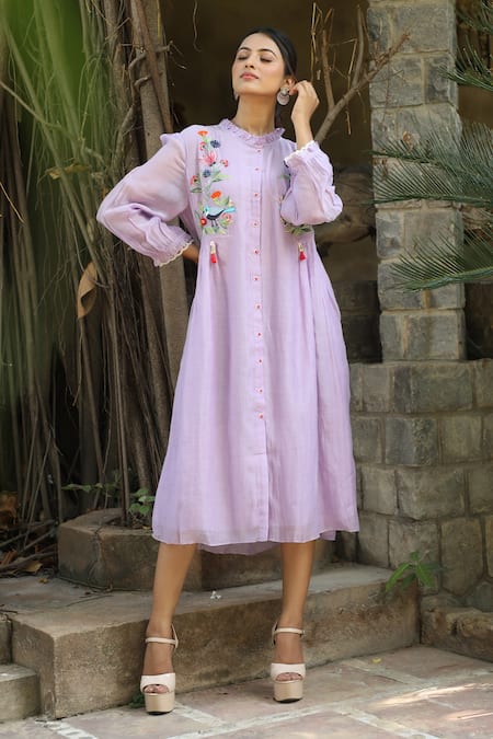 Purple Chanderi Embroidery High Neck Nature Pattern Shirt Dress