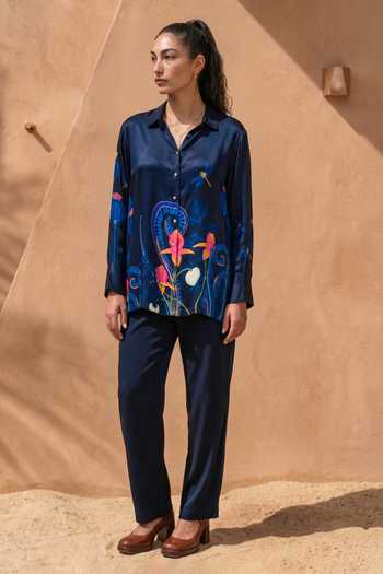 Blue pant set featuring a crepe shirt with colourful floral motifs and a relaxed straight pant. The set pairs a button-front shirt with matching pant.