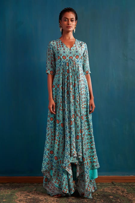 Buy_Nautanky_Blue Crepe V Neck Floral Print Dress _Online_at_Aza_Fashions