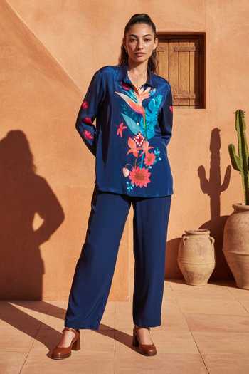 Blue shirt and pant set in crepe with a bold floral print on the shirt. The set includes a relaxed-fit shirt and matching straight pants.