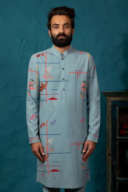 Greyish blue kurta with stripes, printed motifs & front button placket. Paired with printed churidar.